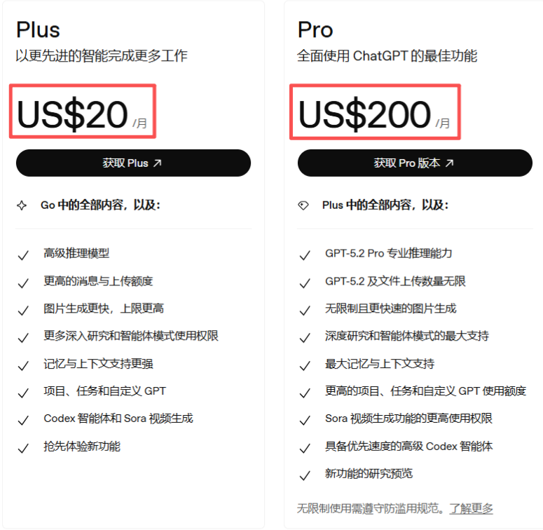 chatgpt官方其他套餐对比: