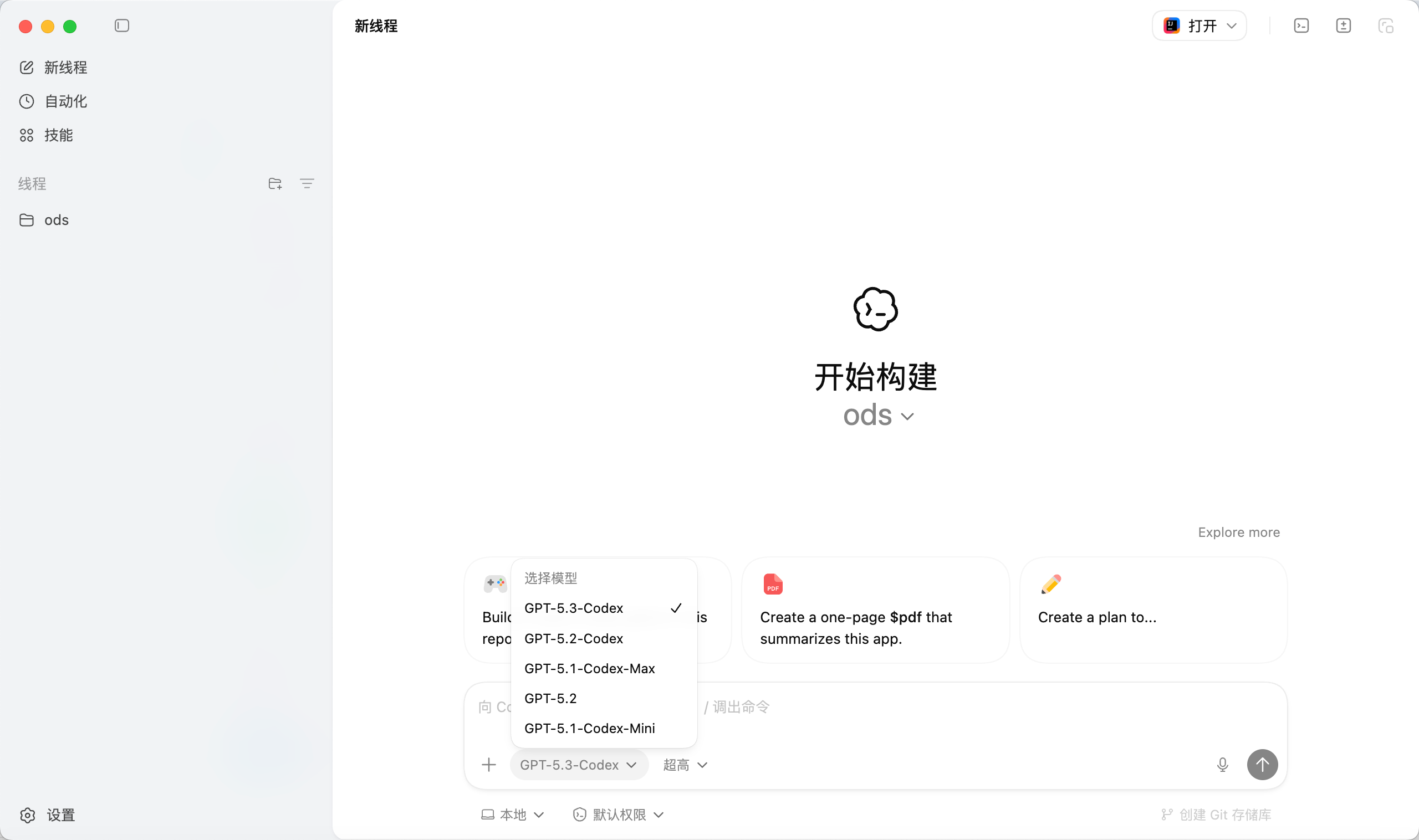 4、也支持Macos 14+系统中,安装Codex app,使用OAuth认证登录,选择gpt-5.3-codex最新模型使用。