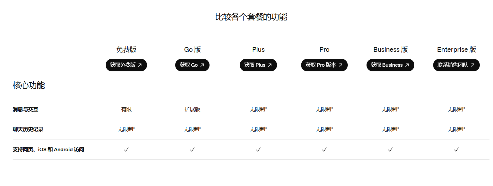 5、ChatGPT官方各个套餐的功能及参数比较: